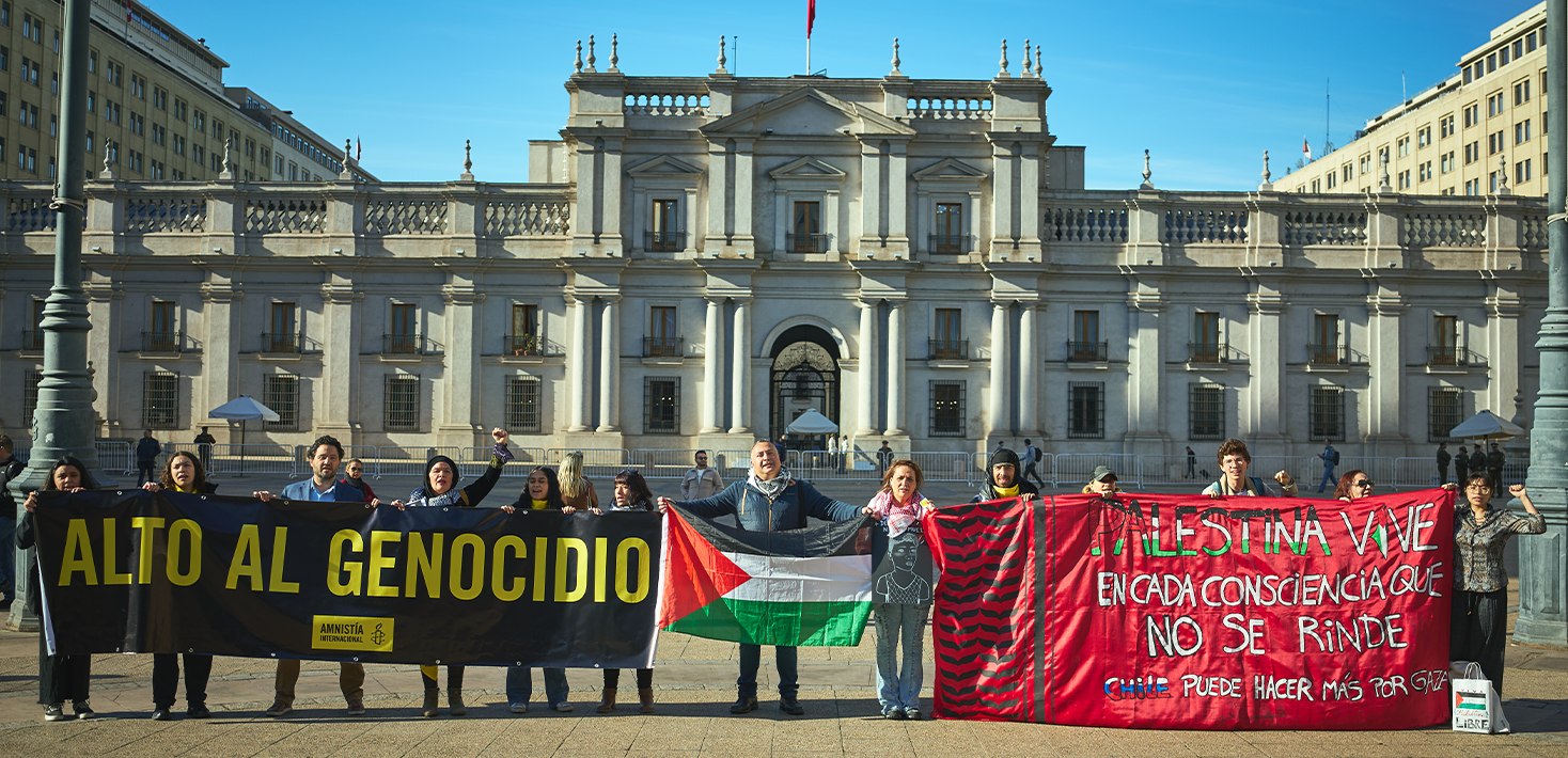 Esta mañana, activistas de Amnistía Internacional Chile realizaron una manifestación frente al Ministerio de Relaciones Exteriores y posteriormente en La Moneda, donde entregaron a las autoridades un petitorio con ocho medidas urgentes para que el Gobierno de Chile y el Congreso Nacional contribuyan a poner fin al genocidio perpetrado por Israel contra el pueblo palestino.