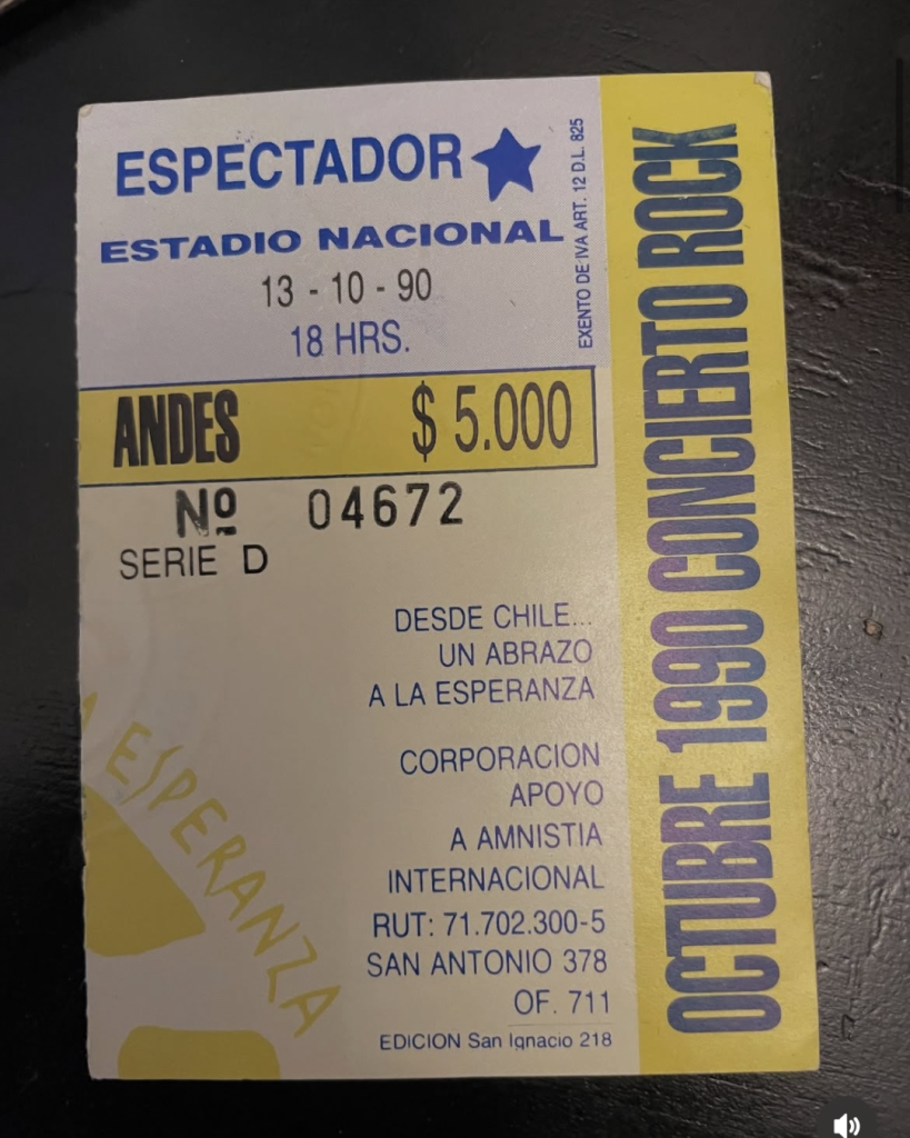 Era estudiante universitaria en Valdivia. Nos organizamos, juntamos plata y viajamos en tren para llegar a una galería que jamás olvidaré. Veíamos la democracia como la gran esperanza. Ha sido por lejos el mejor concierto de mi vida. Gracias por tanto Amnistía Internacional porque en ese Estadio que se había teñido de tanto dolor, lloramos hasta el infinito. La Cueca Sola nunca estuvo tan acompañada.